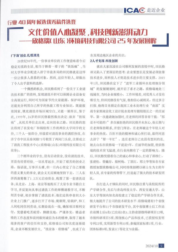 2024年是中國工業清洗行業規模化發展的第40個年頭,也是欣格瑞公司成立的25周年。40年來,中國工業清洗行業經歷了從無到有、從小到大、波瀾壯闊的發展歷程,工業清洗行業在從業人數、技術水平、裝備能力、行業規模和社會影響等方面都發生了巨大的變化。過去的25年,欣格瑞與工業清洗行業一樣,也經歷了初創、生存、發展的生命歷程。40年來,行業內涌現出一大批優秀企業和行業專家,我們一直在向行業前輩和標桿企業學習,我們要向這些專家和優秀企業致敬!我們回顧走過來的道路,總結分享我們的發展心得,衷心希望能為廣大同行提供一些有益的借鑒,以回報行業老師和同仁的厚愛。未來,欣格瑞將在行業協會的領導下,繼續艱苦奮斗,錘煉內功,不斷創新,和廣大清洗行業從業者們一起努力,為中國工業清洗行業發展貢獻力量,助力中國清洗行業更繁榮,讓“中國清洗”的旗幟在世界各地勝利飄揚。