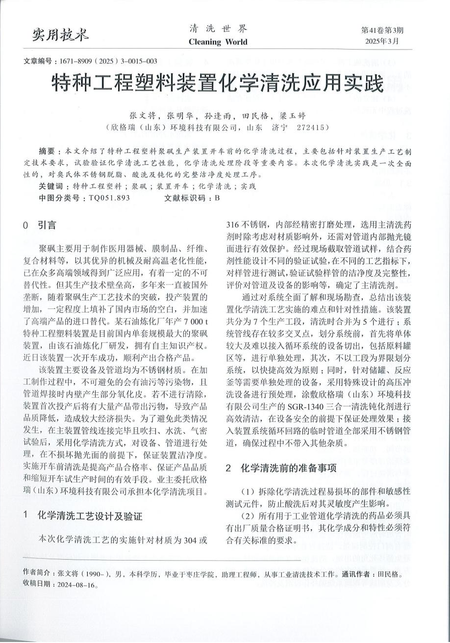 我司張文將撰寫的《特種工程塑料裝置化學清洗應用實踐》論文,正是基于欣格瑞公司在某聚砜生產裝置開車前成功實施的化學清洗項目,系統性地介紹了特種工程塑料聚砜生產裝置開車前的化學清洗過程,主要包括針對裝置生產工藝制定技術要求,試驗驗證化學清洗工藝性能,化學清洗處理階段等重要內容。